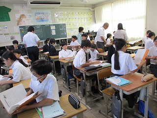 5時間目に1-4にて、現職教育研究の一環として、英語科の校内研究授業を行いました。Unit5 My Brother in Hawaii Read and Thinkという単元で、三人称単数の現在形の用法、形を理解し、第三者について話したり書いたりすることについて学習しました。