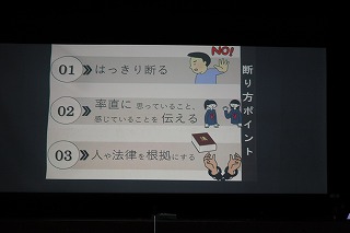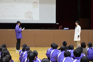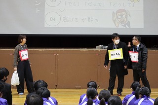 後半には、学年の先生方によるロールプレイが行われ、薬物に誘われた場合には、きっぱりと断る方法を身に付けることが大切であること学びました。