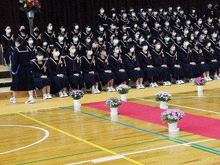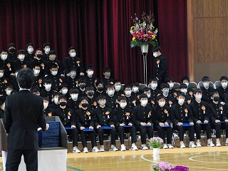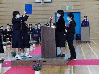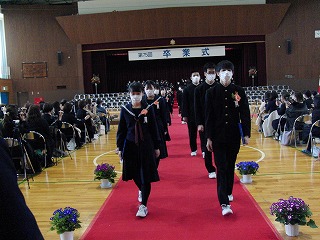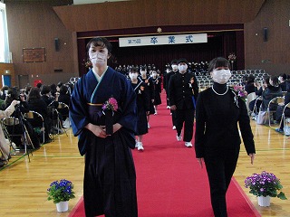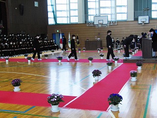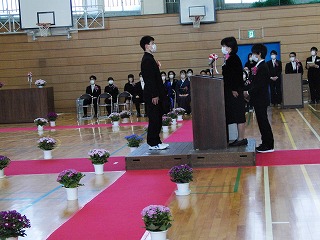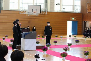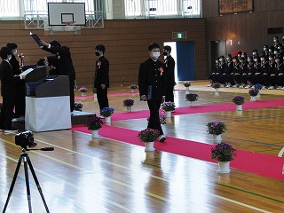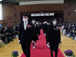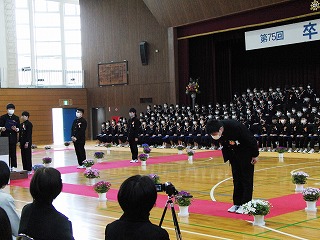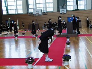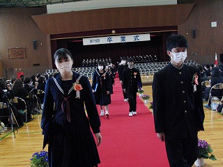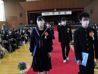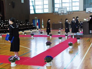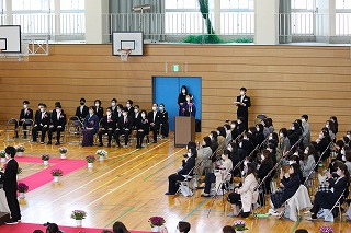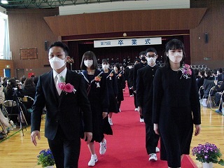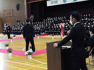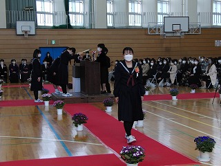 本日、青空のもと、第75回卒業式が行われました。3年生が歌った校歌が流れる中、1組から順に入場してきました。卒業証書授与では、皆、しっかり目を合わせ、マスクをしていてもわかる笑顔で、証書を受け取っていました。送辞では、在校生代表として伊藤生徒会長が卒業生へ感謝のことばと、これからの後輩としての決意を述べました。答辞では、3年生代表として河合さんが、これまでの活動を振り返りながら、仲間や家族へ感謝のことばを述べていました。退場の曲は、「旅立ちの日に」です。練習したての頃に録音したものでしたが、皆さんの歌声で一歩ずつ踏みしめながら体育館を後にしました。堂々とした、立派な姿を見て目頭が熱くなりました。