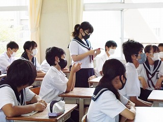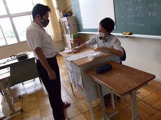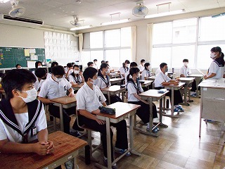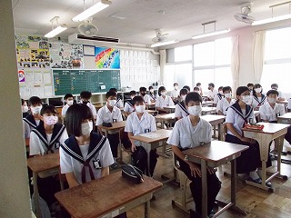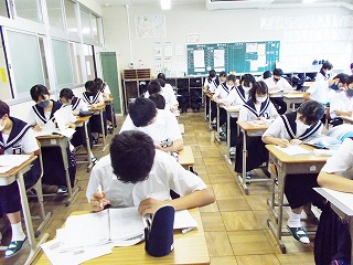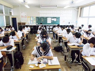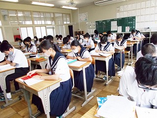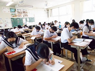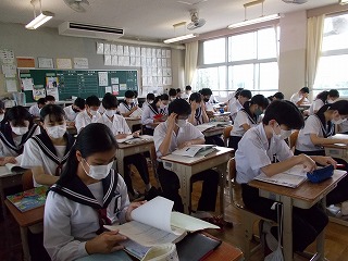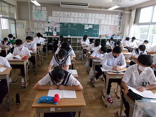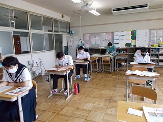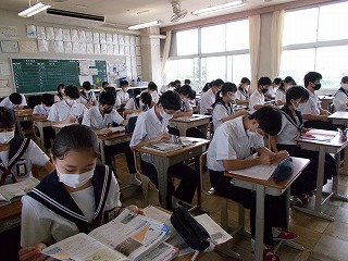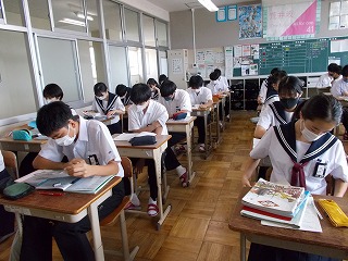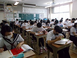 テスト前のクラスの様子です。朝の会では、世の中の感染状況を伝えてしっかり対策をするように呼びかけたり、健康観察をしたりしていました。また、テスト直前まで、どのクラスでも、まとめたノートを見たり、蛍光ペンが引かれた教科書を見直したりして自習をしていました。落ち着いたよい雰囲気が感じられました。