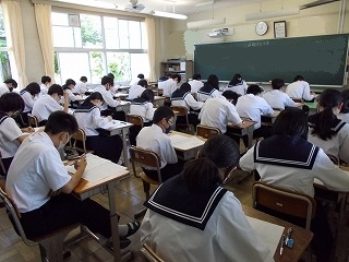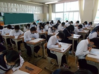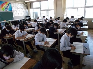 25日(火)、26日(水)の二日間で、定期テストが行われます。1年生にとっては、初めてのテストとなります。登校時に「どうですか?」と尋ねると、「自信がありません」「うーん、厳しいです」「終わりました」という答えが返ってきました。しかし、皆さんの表情は明るく「やるだけのことはやったよ」というサインにも見えました。いざ、テストが始まると、教室は、鉛筆の音だけが聞こえていました。