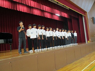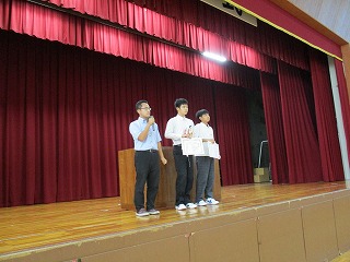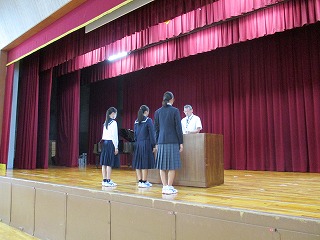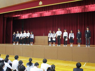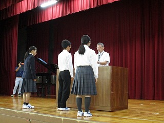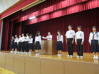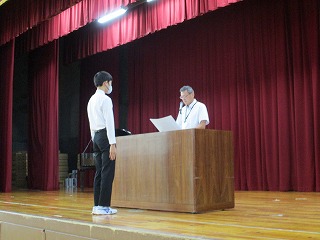 後期がスタートして初めての全校朝礼を行いました。後期生徒会役員認証の後、新旧生徒会長によるあいさつがありました。その後、後期学級委員長の認証を行いました。そのほか、「少年の主張」「読書感想文コンクール」「理科作品展」の表彰がありました。