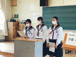 後期を迎えるにあたって、生徒会の役員選挙がリモートで行われました。校長より「パラリンピックの卓球の選手の話で『できないと決めるのは、他人ではなく自分自身です』今の佐屋中は『できる』と信じて、多くの人が挑戦してくれています。よりよい学校になります」という話がありました。立候補した人たちからも、よりよい学校にするために、自分の思いや具体的な手立てが述べられていました。その姿は、とても輝いていました。