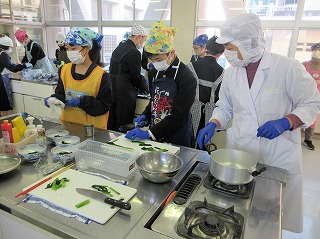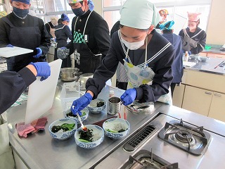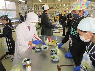 1年生は、家庭科の授業で「調理実習」を行いました。手順に沿って‟小松菜のおひたし”を作りました。授業に参加した栄養教諭から、切り方や盛り付け方などのアドバイスをもらいました。