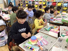 図工の時間には、学習成果展に向けて、前回のお弁当に続きケーキを作りました。