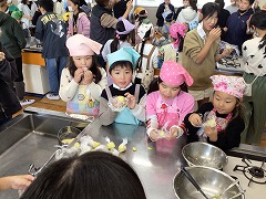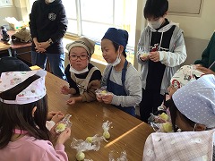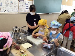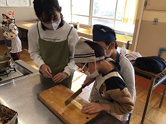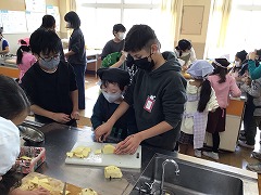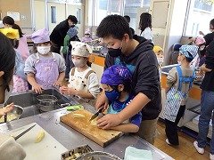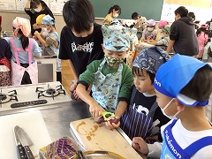 包丁を使う1年生に、6年生が優しく声をかけて一緒にやってくれました。
