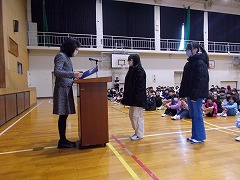 冬休み前集会では、校長先生の話を真剣に聞くことができました。赤い羽根募金ポスターの表彰もありました。