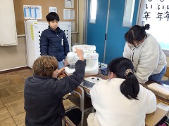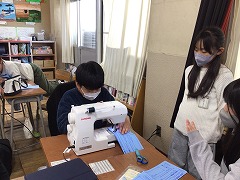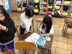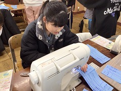 家庭科の授業でミシンを使いました。ミシンの準備に苦戦している様子でしたが、実際に練習布を縫うと「まっすぐにできた」「曲がっちゃった」などと楽しそう話し、班の子と協力しながら行いました。