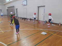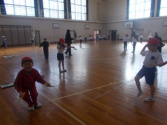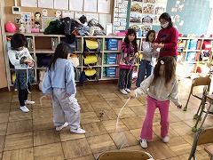 体育の時間には、なわとびの練習をしています。今日は、こうさ跳びをしました。縄をこうさすることが難しいようでしたが、「できるようになったよ」「2回跳べたよ」と嬉しそうに教えてくれました。これから、いろいろな技に挑戦していきます。