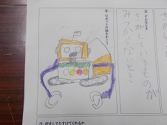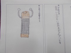 「ロボット」という説明文を読み、困っている人を助けているロボットがいるということを知りました。今日は、どんなロボットがあったらいいかを自分たちで考えました。「探し物を探してくれるロボット」「高いところに手が届かないときに置いてくれるロボット」などいろいろなロボットを考えていました。