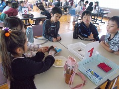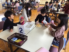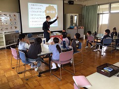 今日は、カルビー株式会社から講師の方をお招きし、出前授業を行いました。1日に食べるおかしの量や、品物によってどれくらいの量を食べることができるのかを教えていただきました。また、出前授業の後は養護教諭から歯磨き指導がありました。