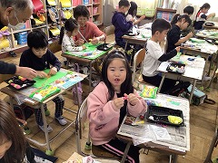 図工では、「すてきなぼうし」の鑑賞会をしました。友達の作品のよいところや工夫をさくさん見つけ、プリントに書きました。