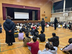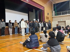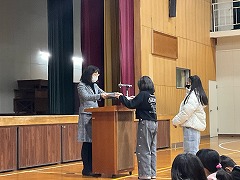 冬休み前集会では、校長先生の話を真剣に聞くことができました。赤い羽根募金ポスターの表彰もありました。