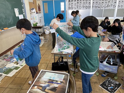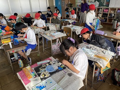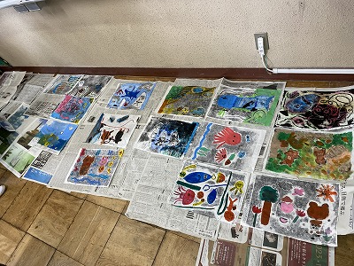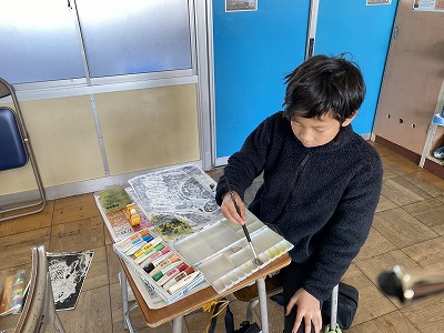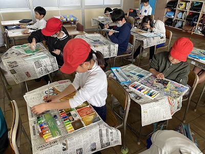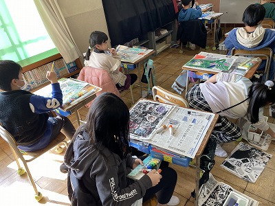 図工では、版画の色付けをしました。