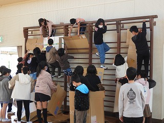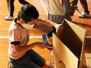 木を支える壁を、段ボールとガムテープ、模造紙を使って作りました。簡単な説明をしただけで、てきぱきと作業を進めていました。