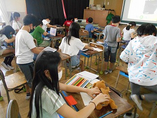 6時間目はICT支援員さんをお迎えして、KomaKomaというアプリを使ったコマ送りの動画を作る学習をしました。パラパラ漫画を描くときのように、少しずつ物を動かしたり、描いた絵の動きを変えたりして、何枚も写真を撮って作ります。