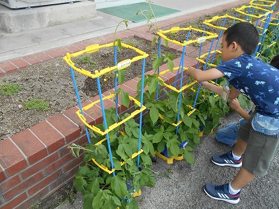 あさがおは、つるがぐんぐん伸びて、元気に育っています。