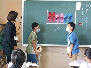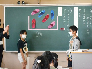 1年生にどんな声をかけるとよいかを考えて、演じていました。1年生役の子はかけられた言葉に「ありがとう」「分かった」と言い、スリッパを並べていました。