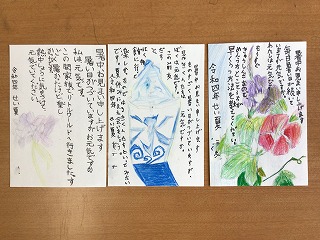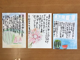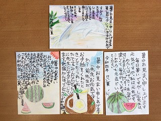 暑中見舞いを書いています。出す相手は「おじいちゃん」「おばあちゃん」「いとこ」「保育園の先生」など自分で決めました。