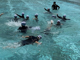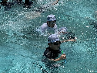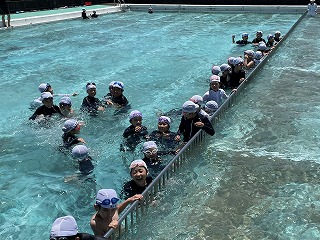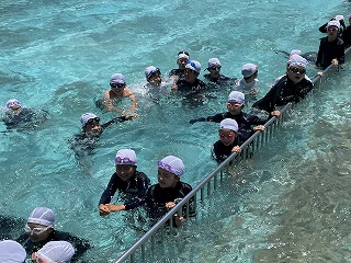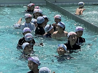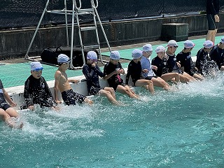 4年生は、深い方のプールに入ります。久しぶりのプールに朝からわくわくしていました。水に入ると歓声があがりました。