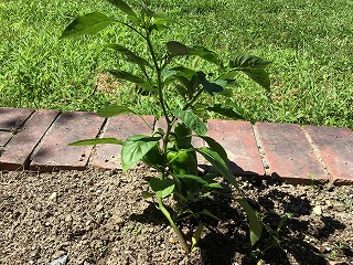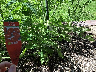 ミニトマトはぐんぐんと茎が伸びて、まだ緑色ですがたくさんの実がなり始めています。