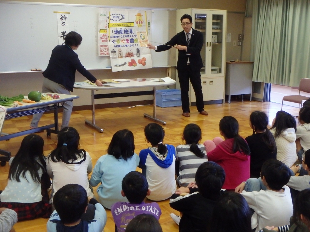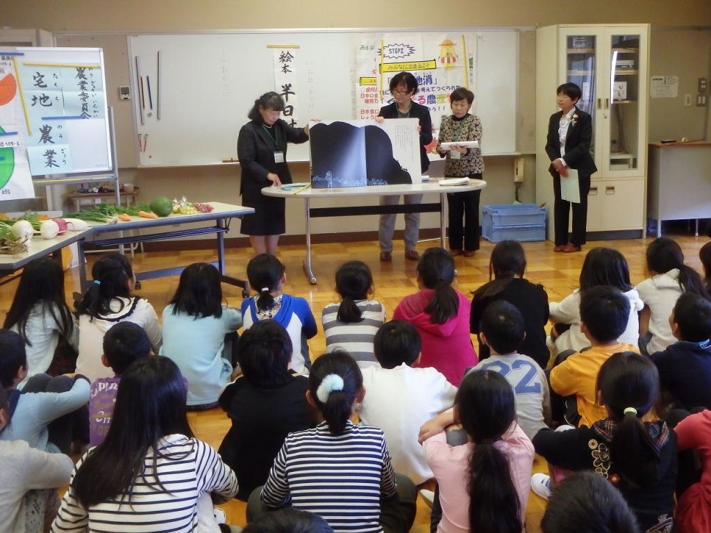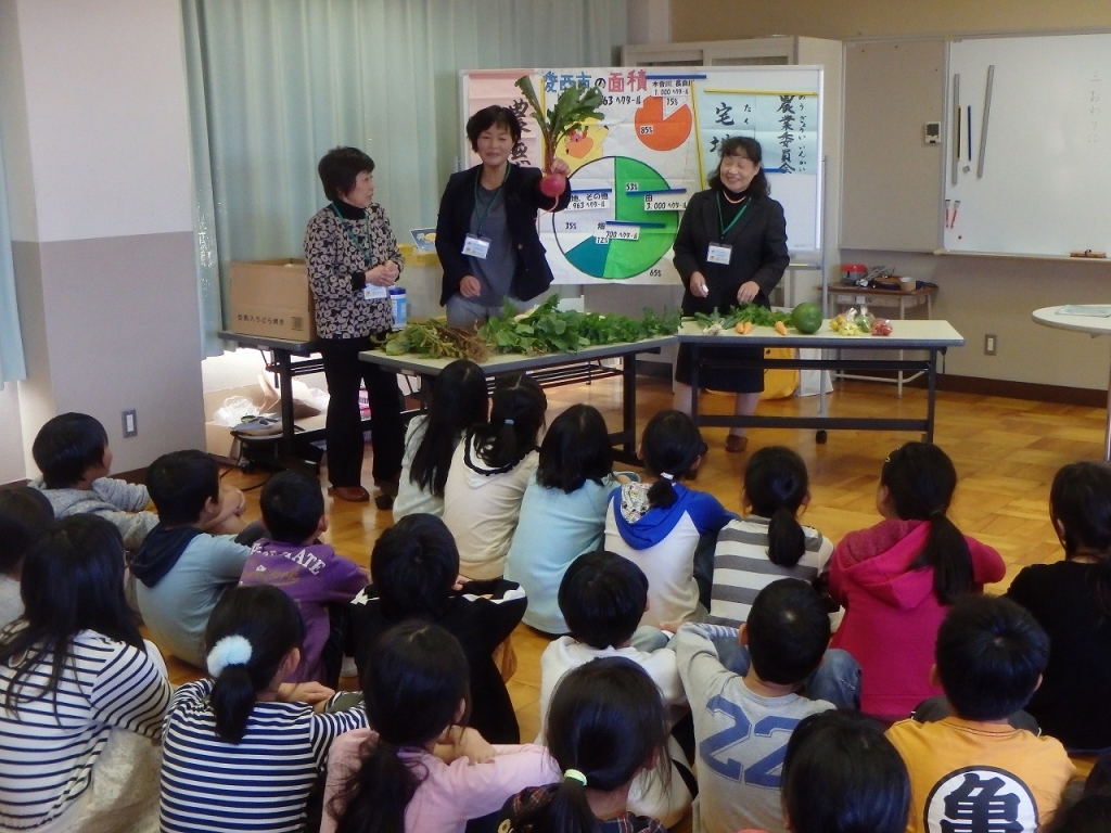 愛西市の産業振興課の職員や農業委員の方たちによる出前授業がありました。愛西市で作られている野菜の紹介や、社会の学習でも学んだ地産地消の取り組みのこと、農地についての話などを聞きました。