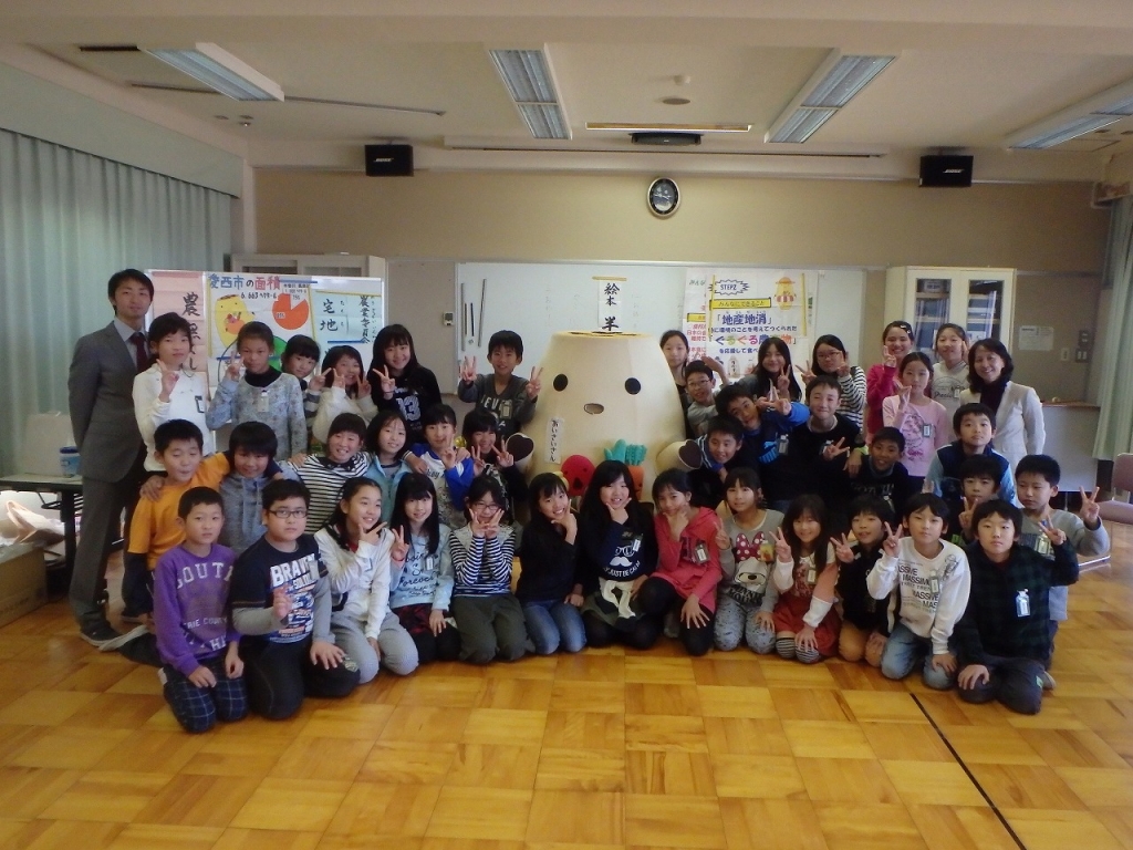 その後、絵本「半日村」を読み聞かせしてもらい、愛西市の農作物の試食をしました。地元で作られた農作物のおいしさを再度知ることができました。スペシャルゲストに「あいさいさん」もやって来て、子ども達は大喜びでした。