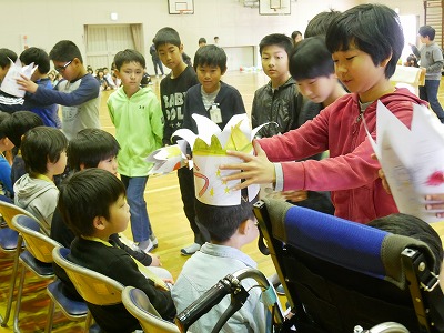 王冠と校歌に思いを込めて、1年生にプレゼントを渡しました。