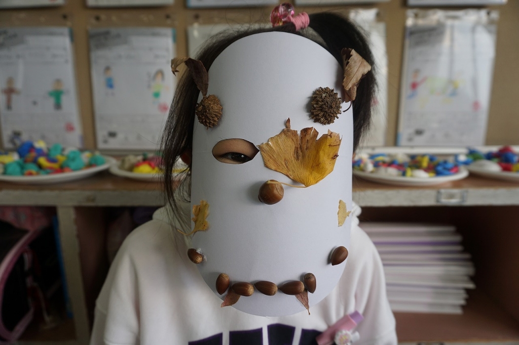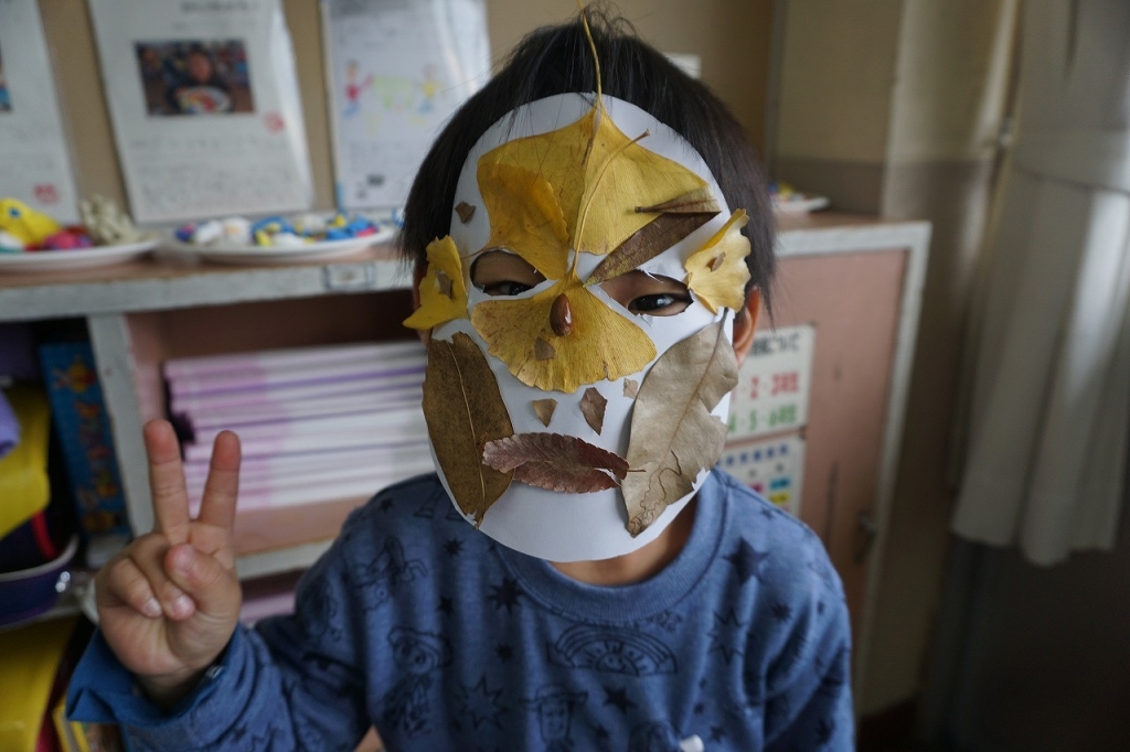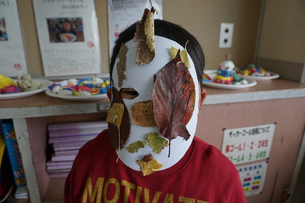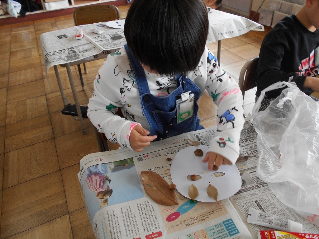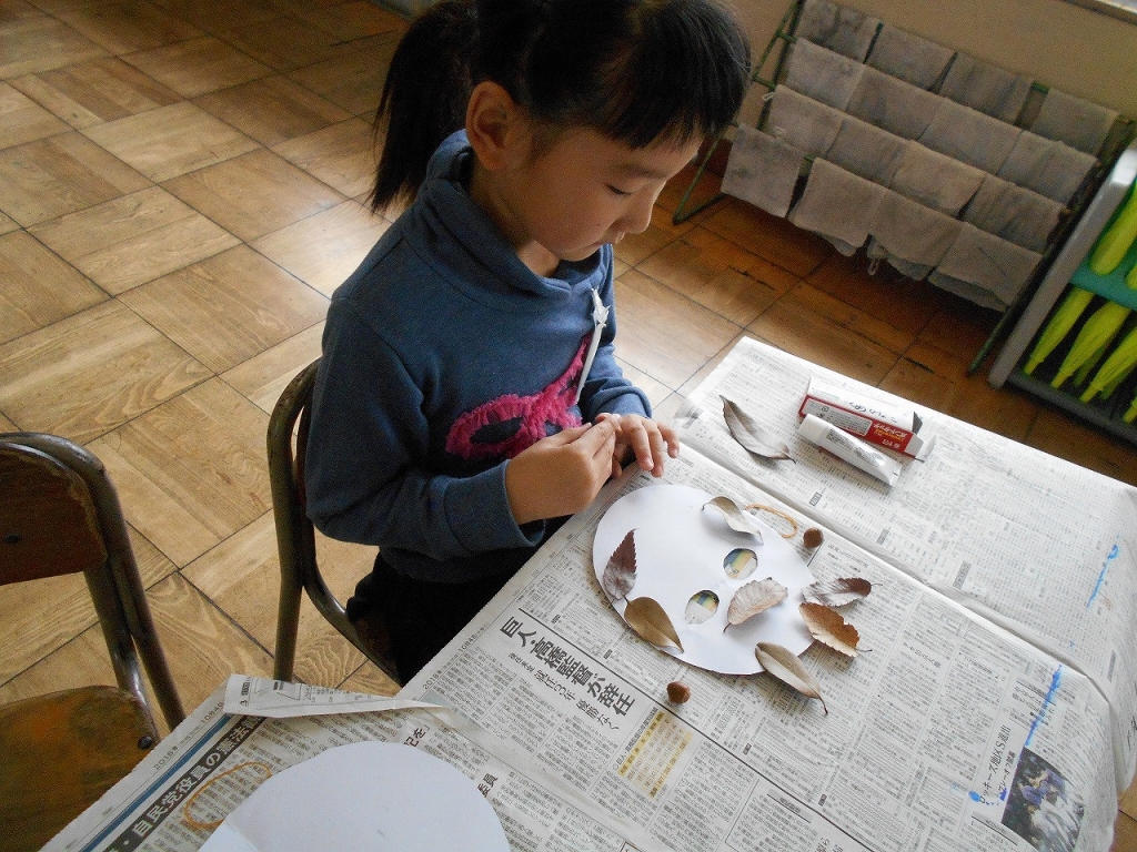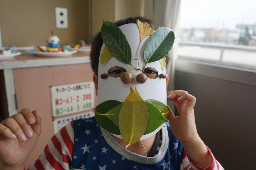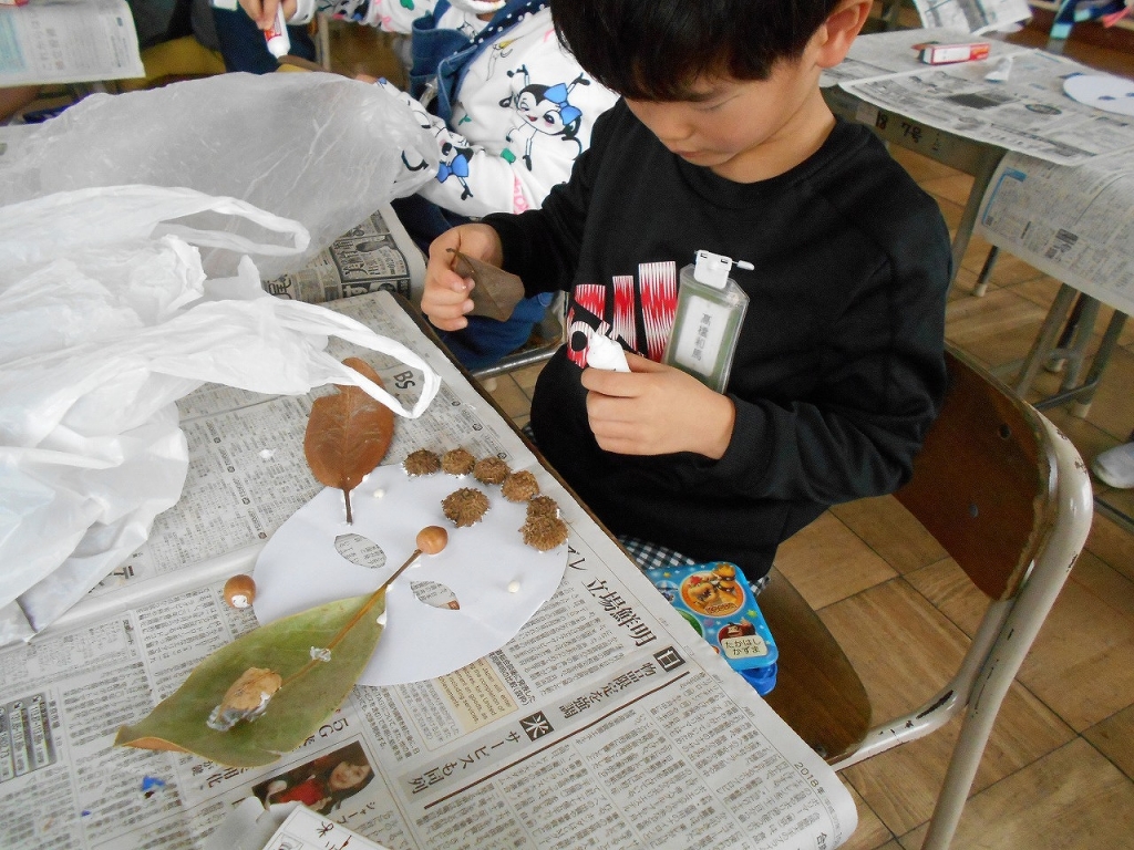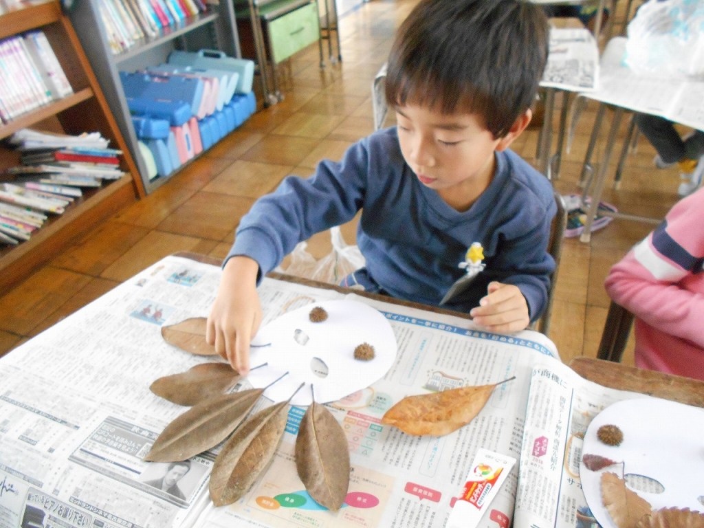 その学習の中で、校庭で集めた落ち葉や木の実を使って、おめんづくりをしました。