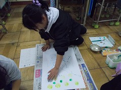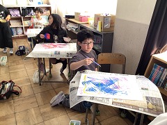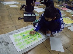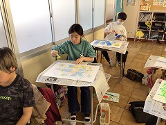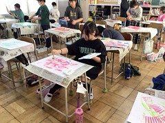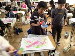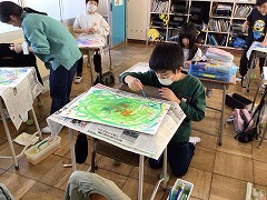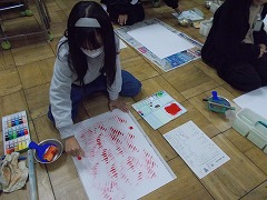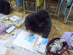 まずは、今までに学習したことを生かし、花に使う部分を絵具で塗りました。