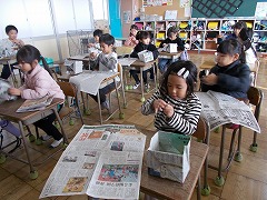新聞紙で箱を作り、その中に丸めた新聞紙を豆に見立てて入れました。