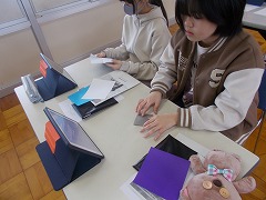 点字の五十音表を参考にしながら、点字器を使って自分の名前や詩を打ったりしました。