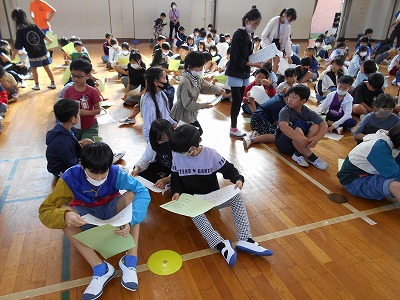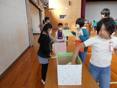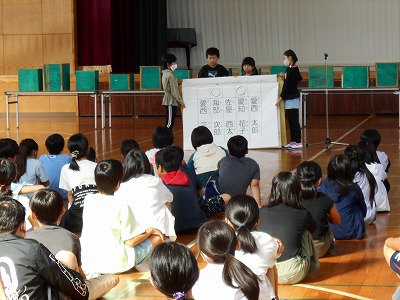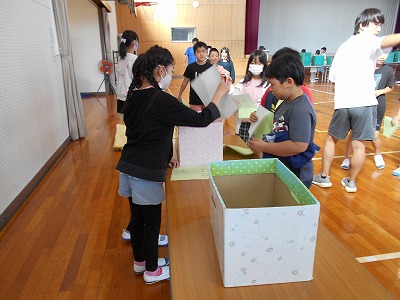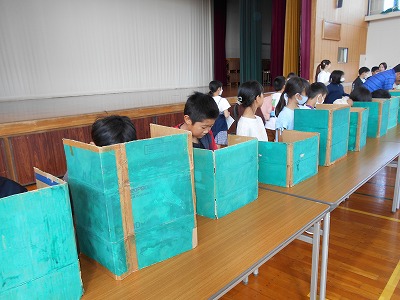 5,6年生の立候補者の演説を聞いた後、選挙管理委員の児童が投票の仕方を説明しました。
