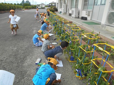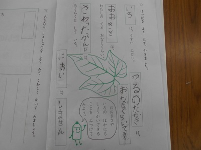 生活科で育てているあさがおの様子をよく見て、観察記録を書きます。