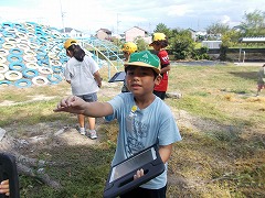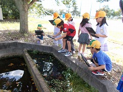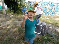 バッタ、コオロギ、カエル、トンボなどたくさんの生き物を見つけると、みんなが集まって見ていました。