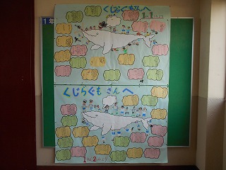 国語の授業で「くじらぐも」を学習しました。くじらぐもに乗って空の旅を楽しむ自分の姿と、くじらぐもに向けてのお手紙をかきました。
