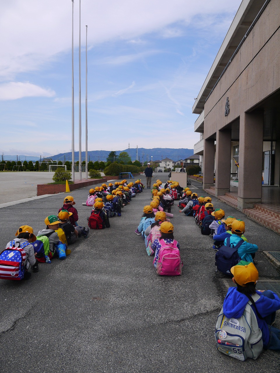 歩いて天王川公園まで行きます。出発前の安全確認。