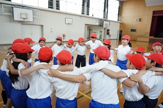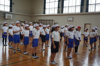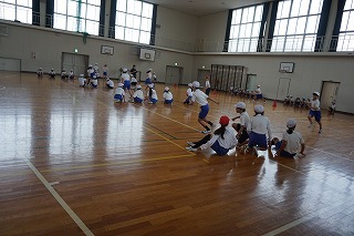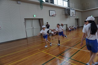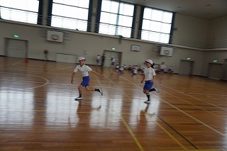 運動場のトラックで行う予定でしたが、雨が降っていましたので体育館で折り返しリレーに変更になりました。