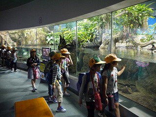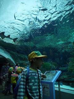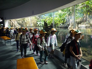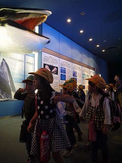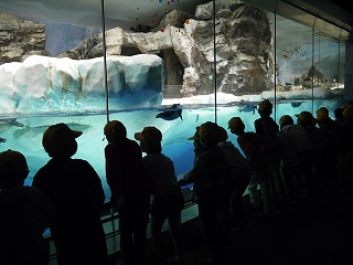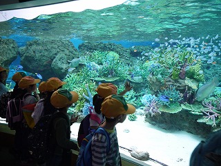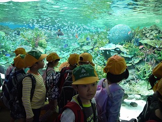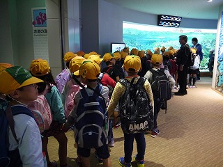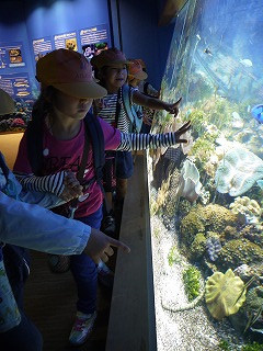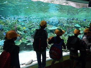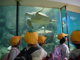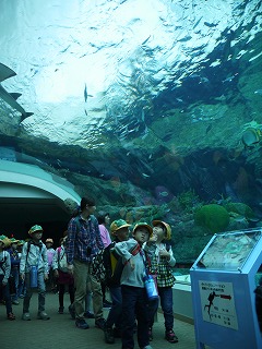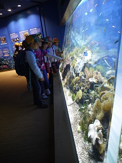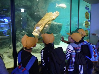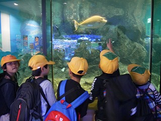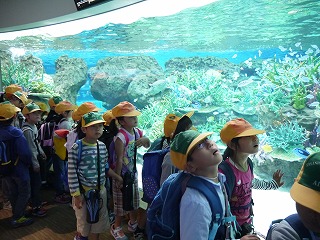 これまで、学活やそのほかの時間を少し使って、海の生き物のDVDも観て様々な生き物の生態を学んでいたので、子どもたちはメジャーなイルカショーやペンギンだけでなく、個性豊かな海に住む様々な生き物をとても興味深く見ていました。