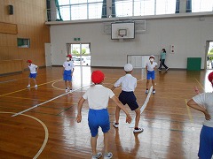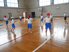 線をまたいで、ジャンプをしながらさまざまなステップや手の動きをつけて身体を動かすものです。