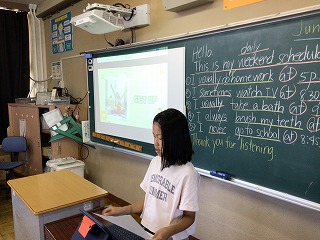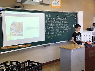 単語の綴りなどまだまだ間違いが見られますが、ALTの先生が「一番大事なのはスピーキングだよ」と話してくださり、子どもたちは自信をもって発表することができました。