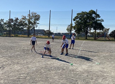 速く塁かフラフープに着いた方の勝ち。というルールで行いました。