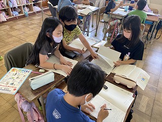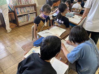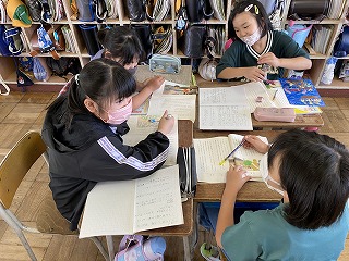 そして物語全体を聞いて、感想を書きました。写真はその感想を元に、それぞれが感じた疑問や想像したことについて意見交換している様子です。