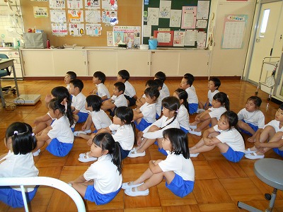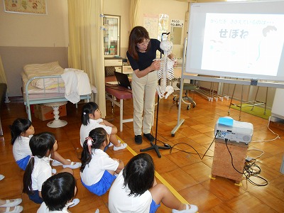 最初に、保健室の先生から「正しい姿勢」についてのお話を聞きました。