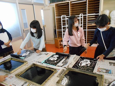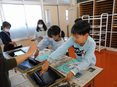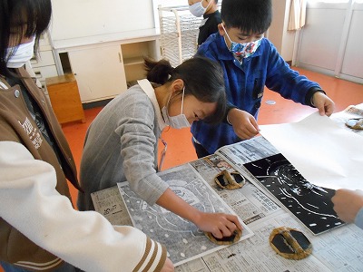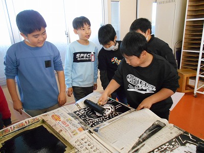 刷り紙がずれないように友達と協力して慎重に行いました。