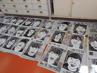 彫刻刀で自分の顔が彫り終わったので、インクをつけて刷りました。