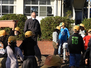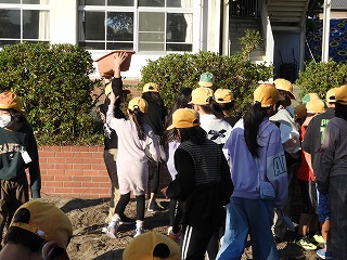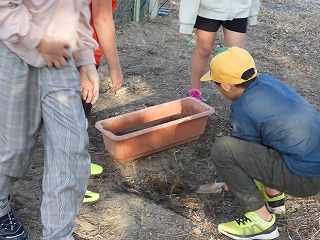 まずはいつもの畑に行き、プランターに土を入れる作業をしました。そこは学習発表会の午後におうちの方々とその子どもたち、そして先生たちで掃除や除草作業をしたところです。見違えるほどきれいな様子を見て、みんな驚いていましたね。畑も、前よりもとても広くなっていて、たくさんの野菜が育てられそうです。