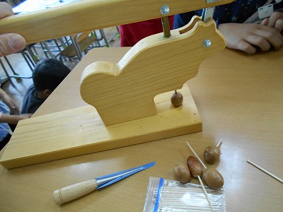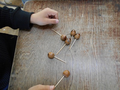 校庭でたくさん見つけたどんぐりを使って、こまを作りました。