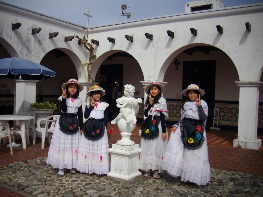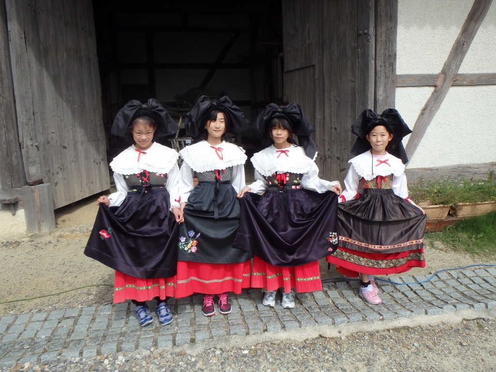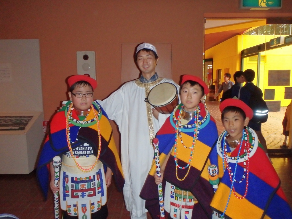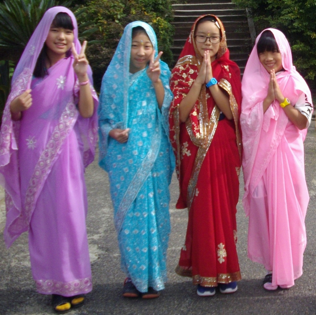 衣の学習として、各国の民族衣装を全員が試着しました。衣類の重さや、生地の違いに驚くグループもあれば、着なれない衣装に戸惑う児童や、うれしさでにっこり笑顔になる児童もいました。