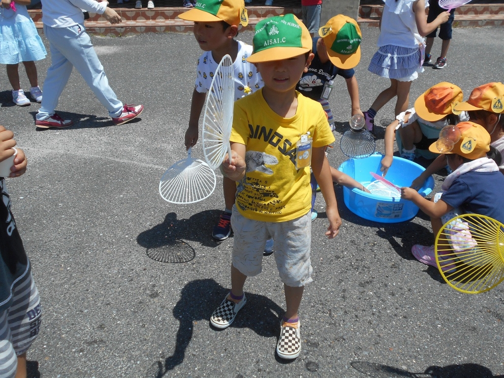 うちわの骨を振ると、一度に多くのしゃぼん玉ができることに気づきましたね。